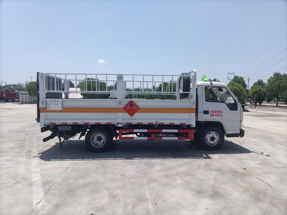 货箱配置:栏板为瓦楞板,(可选装高栏或者低栏),底板为3mm板材,底板上铺有静电胶皮,有静电带、灭火器、防火罩。整车国标反光标示及**告标志。