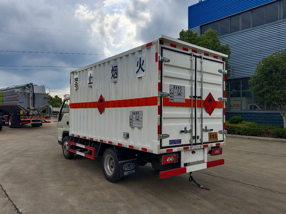 货箱配置:厢体为双层金属骨架结构,外板采用冷轧钢板,中间填充阻燃泡沫,内饰为铝板。底板为平板上铺防静电胶皮。厢内两侧加装固定货物卧环,门框带防盗报**器,顶部带烟雾报**器,厢体右侧选装侧门,随车配2个灭火器,危险标志牌,防火帽,危险品三角顶灯