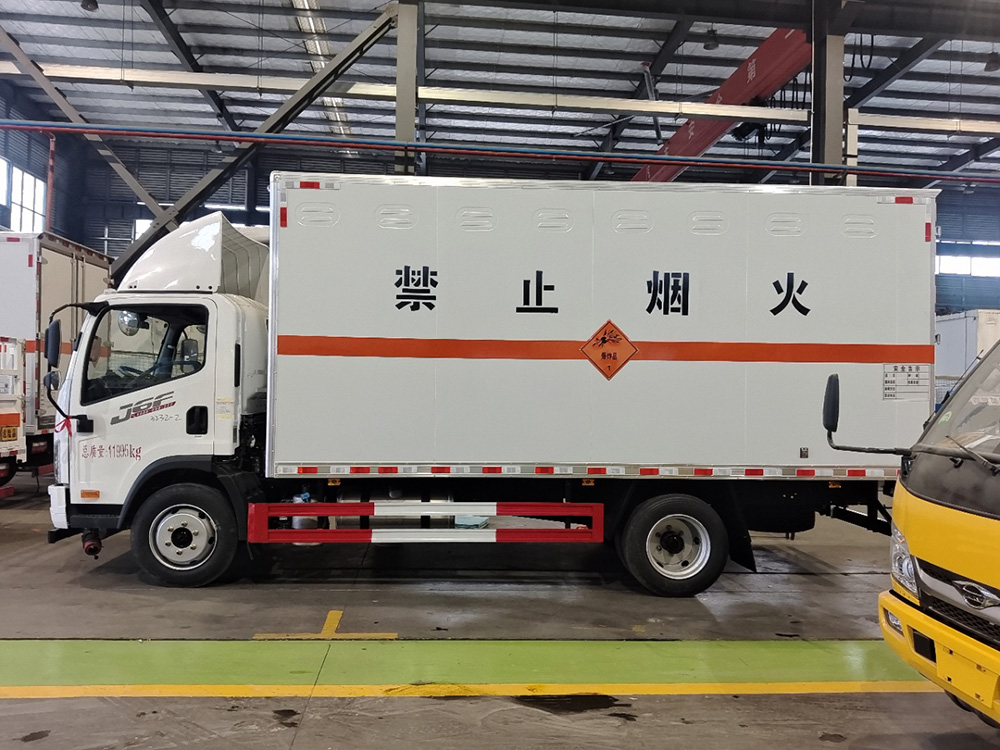 货箱配置:厢体为双层金属骨架结构,外板采用冷轧钢板,中间填充阻燃泡沫,内饰为铝板。底板为平板上铺防静电胶皮。厢内两侧加装固定货物卧环,门框带防盗报**器,顶部带烟雾报**器,厢体右侧选装侧门,随车配2个灭火器,危险标志牌,防火帽,危险品三角顶灯。